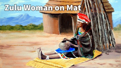 This is a typical cultural setting in a Zulu Kraal. The headdress the woman is wearing signifies that she is a married woman. Unattached zulu girls have a very much smaller band around the forehead.