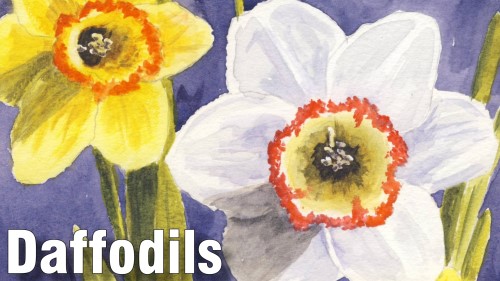 In Springtime certain areas become very colourful with the arrival of daffodils. At times one can see them in huge patches in the fields and parks, while many are just randomly scattered all over the place. Then, of course, they can be found decorating many gardens. You will paint two types in watercolour.